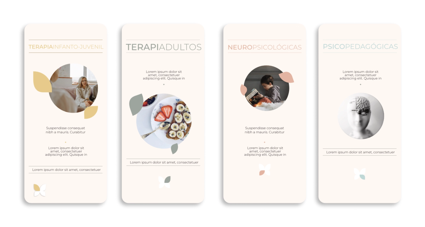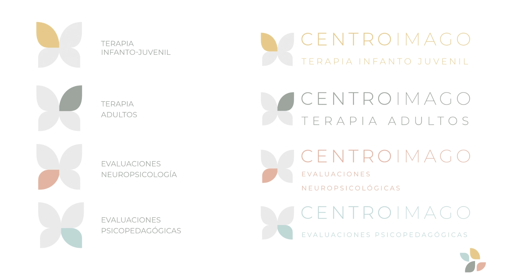 La identidad se construyó a partir del símbolo de una mano liberando una mariposa —metáfora del proceso terapéutico— y una paleta cromática natural con tonos verdes, beige y blancos que transmiten calma y equilibrio. Cada especialidad del centro se representa con un color propio, facilitando la comprensión visual y el reconocimiento de los servicios.